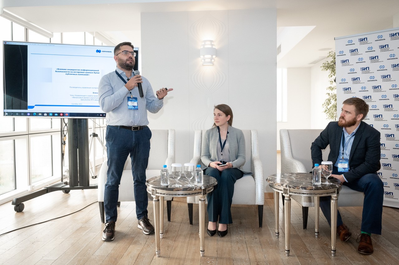 С докладом выступили Елена Мерекина, к. э. н., представитель экономического факультета МГУ и Никита Леушин Руководитель управления контроля информационной безопасности ПАО «ГМК «Норильский никель». «Подход «Норникеля» к обеспечению информационной безопасности комплексный. Одним из направлений нашей деятельности является масштабная аналитическая работа, нацеленная на выявление рисков и минимизацию угроз, в том числе посредством изучения тенденций рынка» — прокомментировал Леушин. Тема вызвала живой интерес у участников заседания, дискуссия продолжилась в кулуарах, после завершения официальной части мероприятия. «Мне как теоретику было интересно изучить практическую сторону данного вопроса и услышать оценки и выводы участников дискуссии, основанные на опыте их операционной деятельности» — отметила Елена Мерекина.